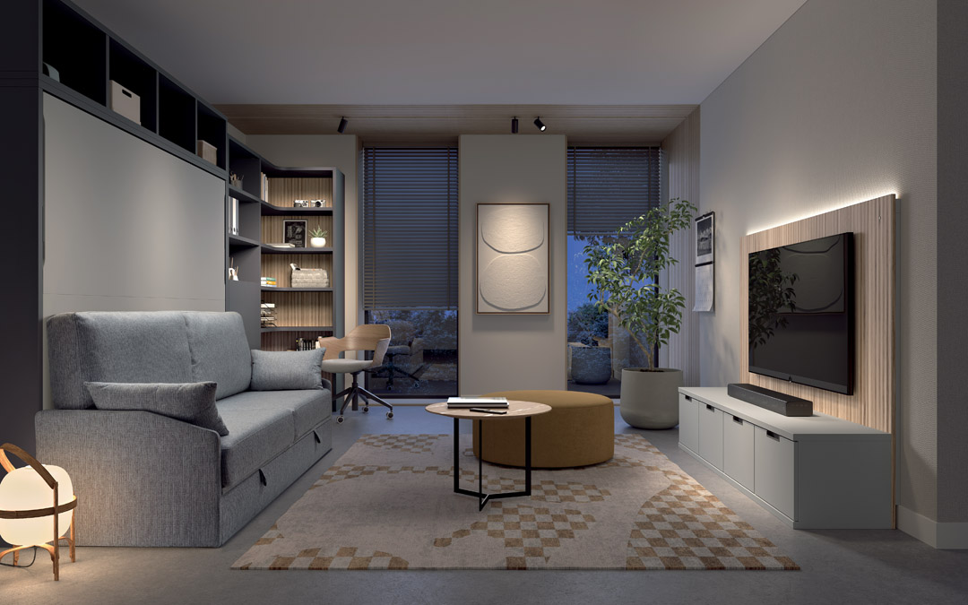 The Pizarra Terra Living Murphy Bed redefines modern living by seamlessly combining style, comfort, and intelligent space planning. Designed for contemporary interiors, this composition brings together warm Terra wood tones, soft grey upholstery, and elegant Pizarra accents to create a refined yet welcoming atmosphere.