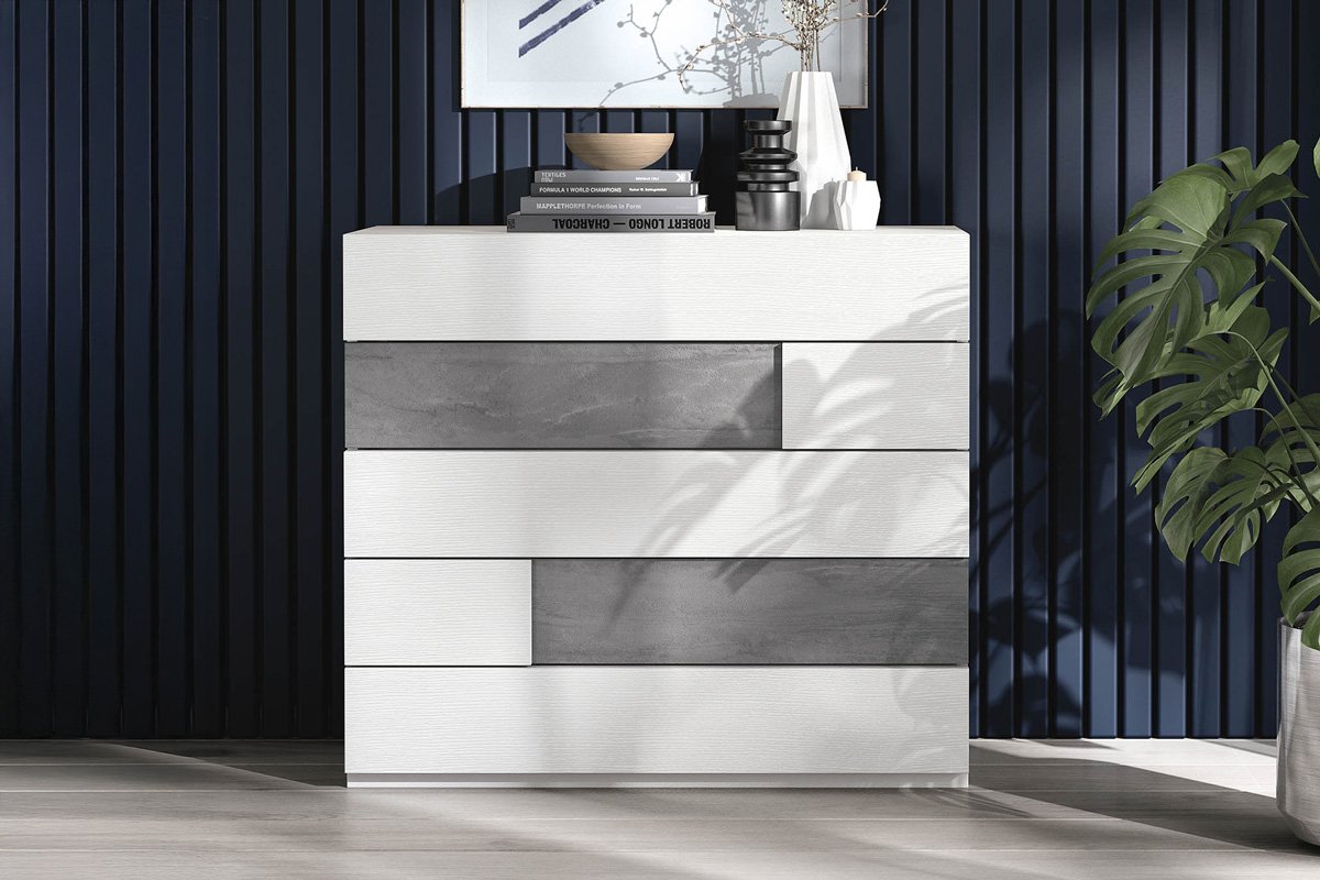 The New Kea Dresser is a bold interpretation of contemporary storage. Its standout design combines crisp white textured surfaces with soft grey inserts arranged in an abstract, layered layout. This interplay of finishes creates a clean yet dynamic rhythm that feels both playful and refined.
